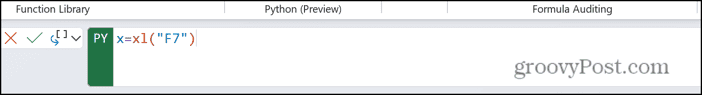 - 사용자 정의 Python 함수 x1()을 사용하여 셀을 직접 참조할 수도 있습니다. 단일 셀을 참조하려면 표준 Excel 셀 참조를 따옴표로 묶습니다(예: x1(“F8”)).
