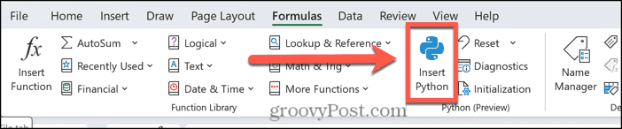 - 수식 리본 에서 Python 삽입 버튼을 클릭합니다.