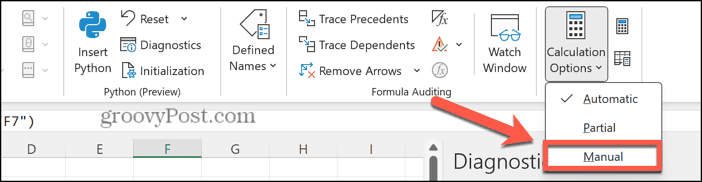 Python이 포함된 셀이 여러 개 있는 경우 이 계산에는 시간이 걸릴 수 있습니다. 셀을 계속 다시 계산할 필요가 없는 경우 수동 계산 옵션을 켜면 특별히 요청할 때까지 셀이 다시 계산되지 않습니다.