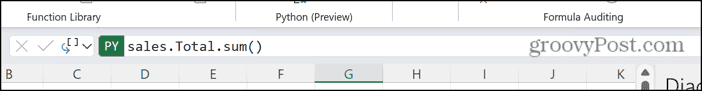 - 데이터 열의 합계를 생성하려면 빈 셀을 선택하고 =PY(sales.Total.sum())을 입력합니다. 여기서 sales를 데이터 세트의 이름으로 바꾸고 Total을 합계를 구하려는 데이터의 열 머리글로 바꿉니다.