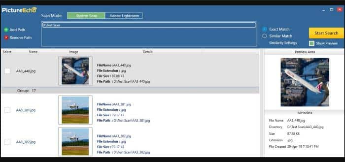 이 프로그램은 Adobe Lightroom에서 중복 사진을 검색하는 기능과 같이 전문 사진가를 위한 다양한 기능을 제공합니다. PictureEcho는 컴퓨터에 저장된 이미지를 검색할 때 네 가지 수준의 유사도 기준을 제공합니다.