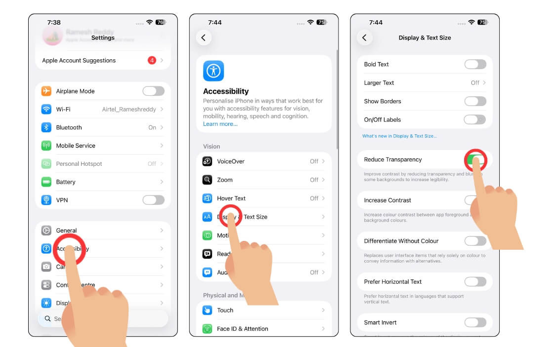 - 이제 아래로 스크롤하여 '투명도 줄이기' 옵션을 탭하세요.
