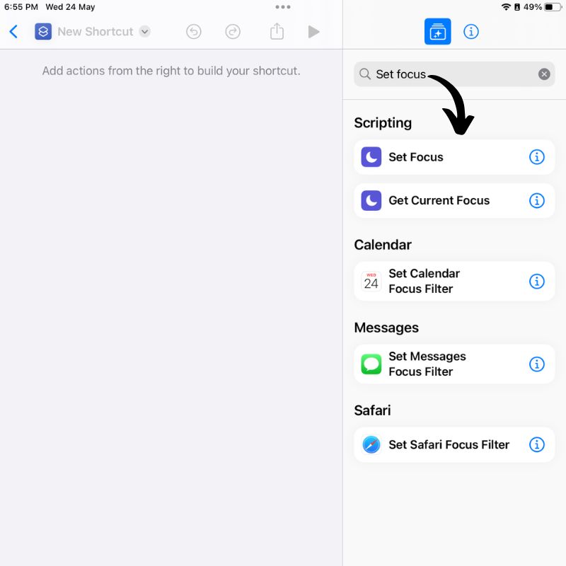- 다음 화면에서 오른쪽 검색창에 " 포커스 설정 " 을 검색하세요. 그런 다음 포커스 설정을 탭하여 새 작업을 만듭니다.