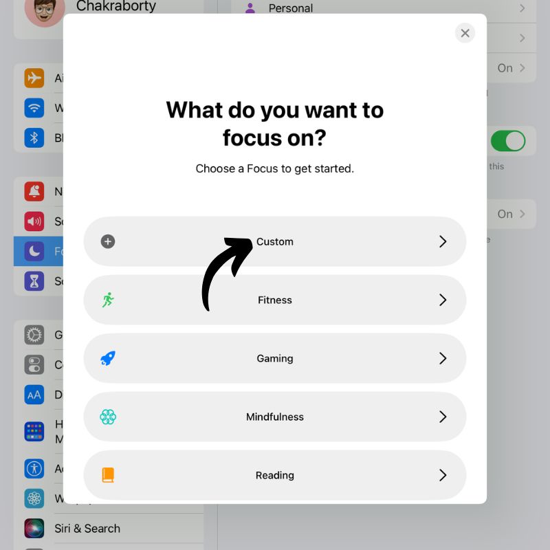 - 다음 화면에서 사용자 지정을 클릭 한 다음 이름, 색상 및 아이콘을 추가하여 새로운 포커스 모드를 만듭니다.